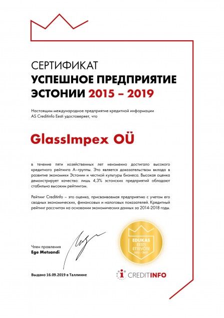 Glassimpex OÜ - одна из компаний входящих в концерн ANDRESE GRUPI AS. Имеет широкую известность среди всех стеклообработчиков в странах Балтии и занимает одну из ведущих позиций по поставкам листового стекла в регионе.